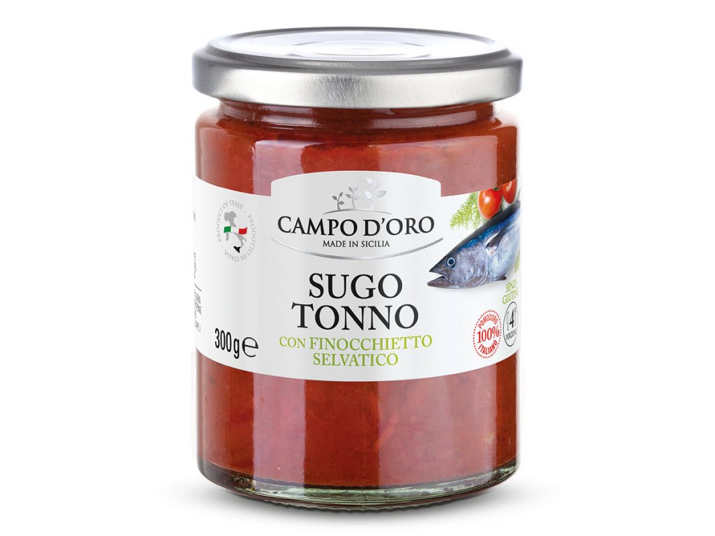 Složení: drcená rajčatová dřeň, slunečnicový olej, tuňák 7 %, divoký fenykl 2 %, česnek, sůl, bazalka, semena fenyklu, cukr, vinný ocet, regulátor kyselosti: kyselina citronová.